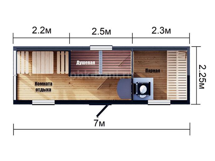 В бане возможно поменять цвет, комплектацию и планировку.