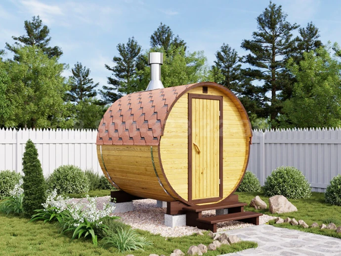 Мобильная баня-бочка отличается цилиндрической формой: аккуратность округлых линий гармонирует с красотой древесины, металлическими элементами. Обеспечивает высокий уровень приватности: в проекте предусмотрено одно миниатюрное окно, которого достаточно для проникновения солнечного света. Входная группа представлена распашной дверью и компактными ступенями, по которым легко подниматься и спускаться в любое время года.