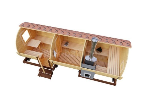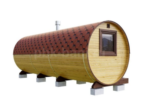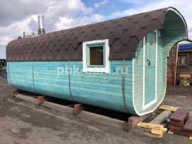 Следующий Баня-бочка «Глория» – вместительный проект с привлекательным дизайном экстерьера. Подходит для круглогодичного использования, практичная форма позволяет разместить баню на участке любой конфигурации.