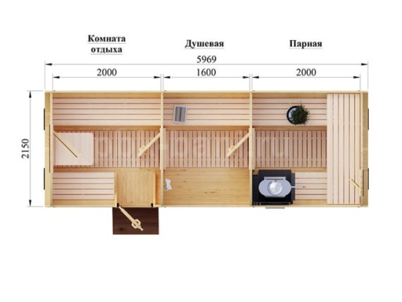 В планировке реализованы три помещения, есть все для полноценного отдыха. Первая зона – комната отдыха, она обставлена столом и скамейками для размещения не менее 3-4 человек. За комнатой следует уютная душевая, здесь тоже есть скамейка для комфортного приема водных процедур. Завершает планировку просторная парная, в которой установлены печь, скамейки и лежаки, на которых удобно наслаждаться релаксом, вытянувшись в полный рост. Обустроен решетчатый настил для отвода воды и ровности пола, все помещения разделены распашными дверьми.