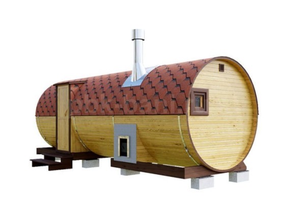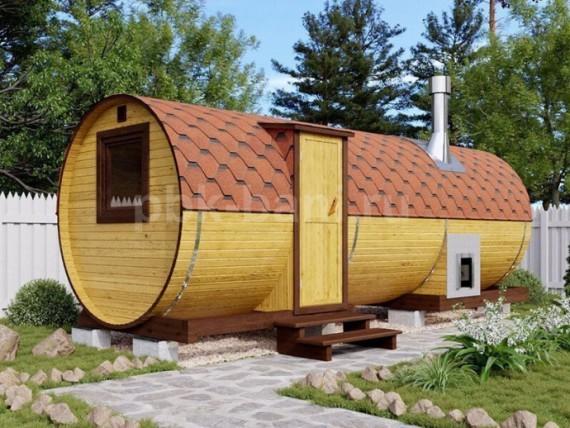 Баня-бочка имеет округлую форму, обеспечивающую равномерное распределение и свободную циркуляцию тепла. Обустроена плавно стекающая крыша, предупреждающая скопление осадков, с дымоходом для быстрого отвода дыма. Предусмотрена печь с топкой с улицы, входная группа представлена прямоугольной дверью и двумя ступенями, по которым удобно спускаться и подниматься в любое время года. Завершают композицию квадратные окна, сквозь которые проникает достаточное количество солнечного света: они расположены на высоте роста взрослого человека, поэтому все происходящее внутри остается недоступным для любопытных глаз соседей.