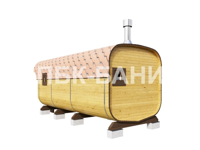 Баня квадро-бочка имеет классическую удлиненную прямоугольную форму, отличающуюся скругленными углами. Верхнюю часть как будто обнимает кровля, центр которой увенчан дымоходом. Проект 5.5 м предусматривает наличие нескольких квадратных миниатюрных окон, расположенных по периметру фасада: они прекрасно пропускают солнечный свет, но обеспечивают защиту от любопытных взглядов соседей. Входная группа дополнена небольшим козырьком, создающим притенение. Баня выглядит эффектно, окруженная мавританским газоном, цветущими кустарниками и мощеными дорожками.