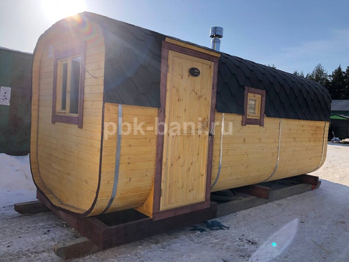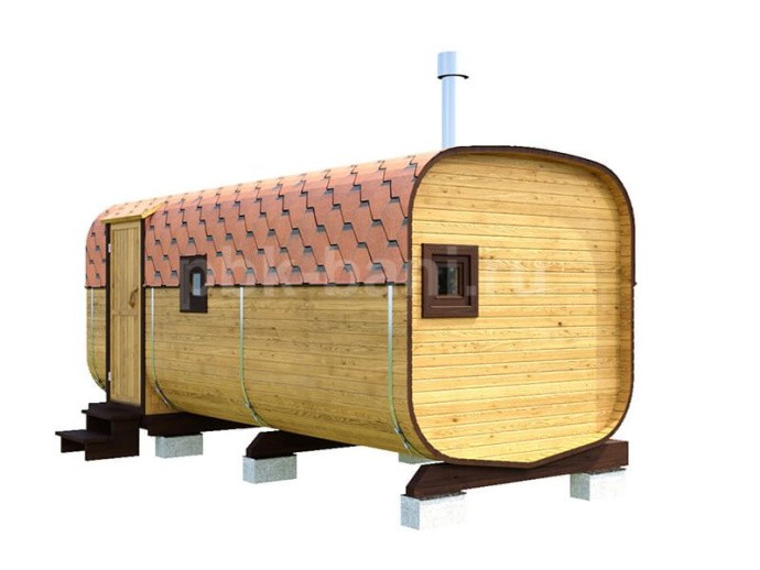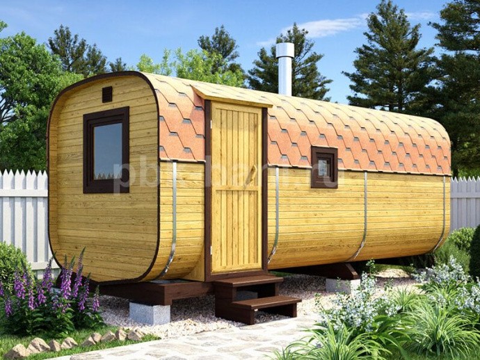 5-метровая баня-бочка – надежный проект, позволяющий наслаждаться оздоровительными свойствами парной в любое время года. Реализованы эргономичные планировочные решения, квадро-бочка характеризуется вместительностью, предусмотрена печь с экономичным расходом дров.