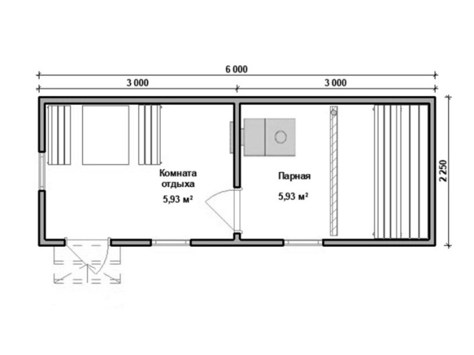 Внутри бани расположены два просторных помещения, разделенных перегородкой. Преодолев ступени, можно попасть в комнату для отдыха, где уютно разместятся стол и лавки, а также зона для хранения инвентаря и верхней одежды. Здесь можно лакомиться чаем и сладостями после приятного отдыха в парилке. Второе помещение – парная, совмещенная с моечным отделением, где находятся печь и лавки, на которых с комфортом разместятся несколько человек.