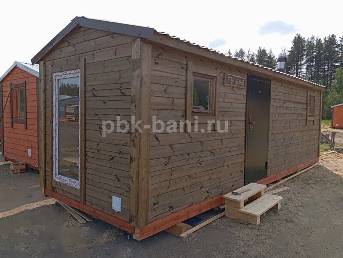 Мобильная баня из бруса 7 метров с панорамным остеклением