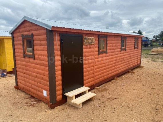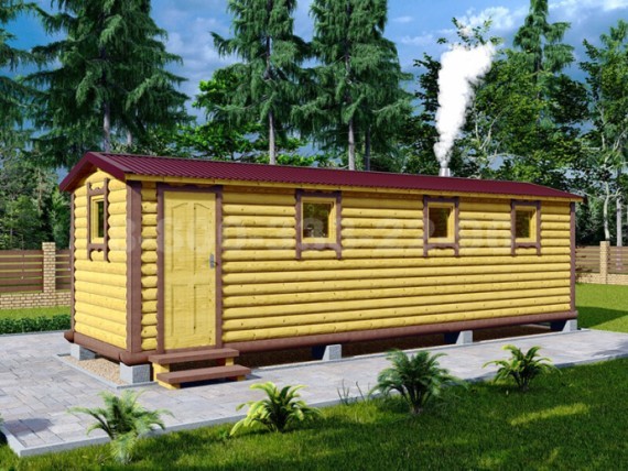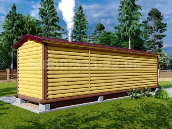 Мобильная баня из бруса 8 на 2,5 – просторная, выполнена в классическом стиле. В основе – синергия экологически чистых материалов и эргономичной планировки, высокая сочетаемость с ландшафтными стилями. Проект обличается вместительностью: одновременно баню могут посещать более 4-5 человек.