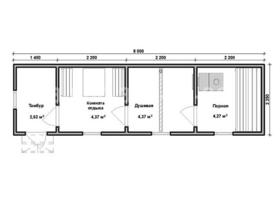 Внутри бани 8х2,5 – четыре больших помещения, разделенных дверьми для обеспечения дополнительной приватности. Вход в баню начинается с прямоугольного тамбура, в нем можно разместить вешалки для уличной одежды и подставки для обуви. Следующая зона – квадратная комната отдыха со столом и лавками: здесь приятно общаться с друзьями и наслаждаться горячими напитками. За ней следует душевая, в самом конце – парная, где предусмотрена печь, обеспечивающая стабильную температуру в любое время года, а также широкие лежаки.