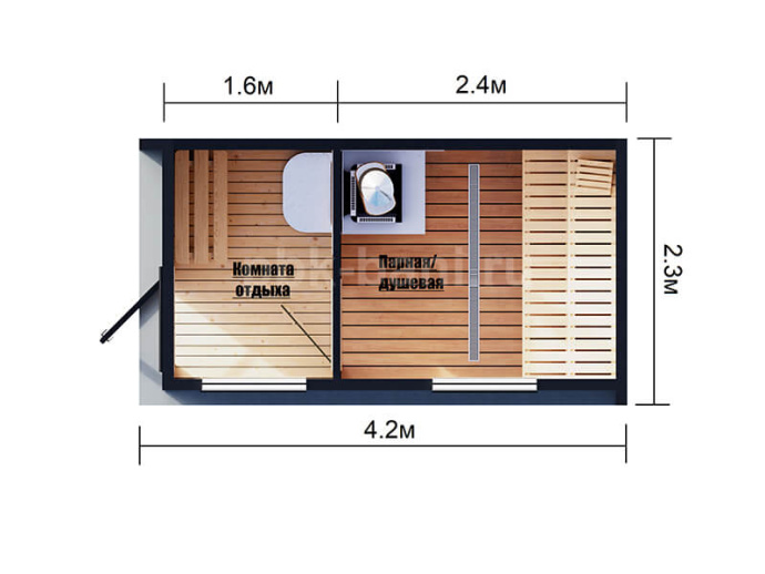 В парном отделении - осиновая вагонка класса "А", в остальных помещениях - имитация бруса класса «В». Высота от пола до потолка в самом высоком месте 2.15м +/-50мм.