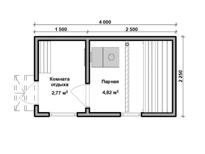 Первое помещение – комната отдыха прямоугольной формы, здесь есть переносная скамья и стол, легко обустроить систему хранения, где можно будет оставить верхнюю одежду. Следующая зона – парная, реализовано визуальное зонирование: около одной стены – печь для комплексного прогрева, около другой – широкие лежаки, в центре обустроен слив для быстрого отвода лишней воды.