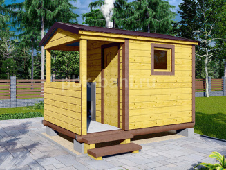 Небольшая прямоугольная дачная баня характеризуется простотой линий, предусмотрена практически плоская кровля (есть небольшой уклон) и два окна, необходимые для обеспечения доступа солнечного света. Вход в баню открывают две ступени, дверь – прямоугольная, создан дымоход для качественного устранения продуктов горения. Сбоку – выносная топка, эффективно экономящая полезное пространство, но без снижения качества прогрева.