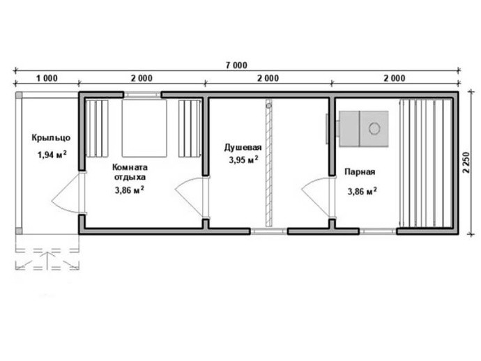 В планировке бани 7 на 2 предусмотрены три прямоугольных помещения, вход в первое открывается с террасы – это просторная зона для отдыха, хранения верхней одежды и общения, дополненная столом и лавками, вешалками. Следующее помещение – помывочная, где можно подготовиться к посещению парной или освежиться после процедуры. В конце находится сердце бани – парилка с лавками для отдыха и печью, предназначенной для поддержания комфортной температуры. Все зоны разделены распашными дверями, гарантирующими достойный уровень приватности для владельцев и их гостей.