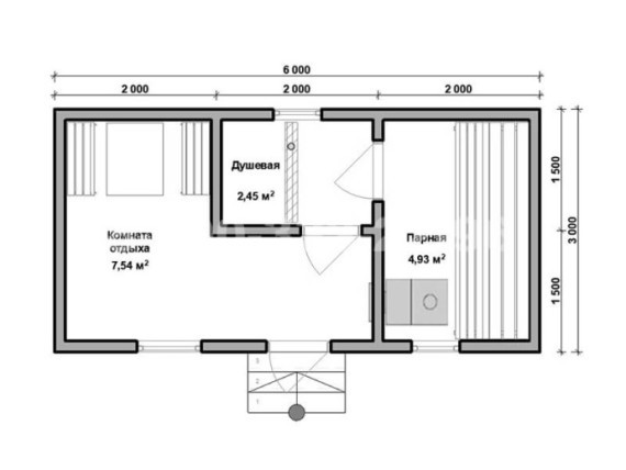 Фасад каркасной бани 6х3 имеет прямоугольную форму, три окна расположены так, чтобы свет проникал во все внутренние помещения. Для отвода осадков предусмотрена скатная кровля, дополненная компактным дымоходом. Входная группа состоит из трех ступеней, по которым удобно подниматься и спускаться даже во время непогоды, и прямоугольной двери.