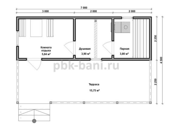 Большая каркасная баня 7х4,5 – уютный проект, в котором предусмотрена терраса. Качественное утепление и вентиляция позволяют посещать парную зимой, летом и в межсезонье. В бане с комфортом разместятся не менее 5-6 человек – прекрасное решение для компаний друзей и семей с детьми.