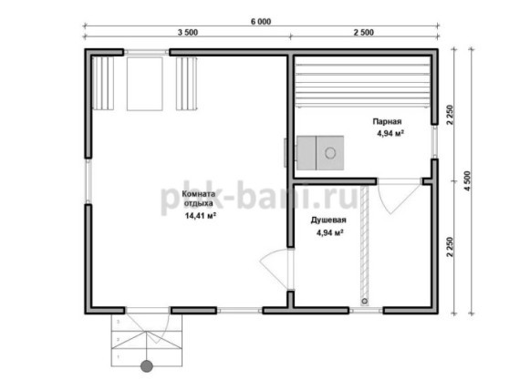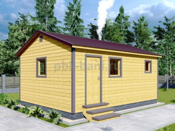 В дизайне экстерьера бани 6 на 4,5 преобладают классические черты: простота форм, оттеночный декор, удобство в каждой детали. Входная группа представлена прямоугольной дверью, рядом – две ступени, по которым удобно подниматься и спускаться. Скатная кровля, на которой возвышается дымоход, не дает скапливаться осадкам. Предусмотрены пять окон квадратной формы – они имеют разный размер и отлично пропускают солнечные лучи, которые дополнительно прогревают помещения.