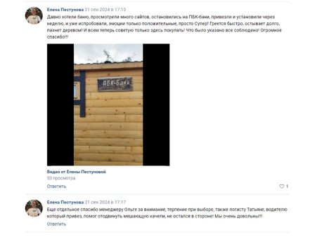 Давно хотели баню, просмотрели много сайтов, остановились на ПБК-бани, привезли и установили через неделю, и уже испробовали, эмоции только положительные, просто Супер! Греется быстро, остывает долго, пахнет деревом! И всем теперь советую только здесь покупать! Что было указано все соблюдено! Огромное спасибо!!!