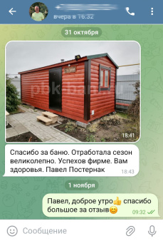 Спасибо за баню. Отработала сезон великолепно. Успехов фирме. Вам здоровья. Павел Постернак