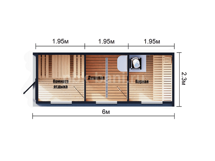 «Фаина» 6×2.3 м — это настоящая баня с душевой, парной и комнатой отдыха, собранная в заводских условиях и готовая к установке без лишних затрат и ожиданий. Универсальный проект, адаптируемый под ваш вкус и участок. Закажите и получите максимум уюта с минимальными хлопотами!
