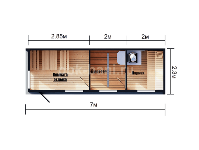 Внутренняя планировка: парная, душевая и комната отдыха. Проект комфортно вмещает 2–4 человек.